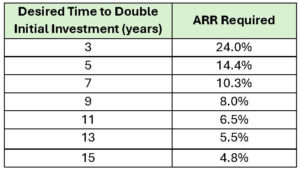 The Rule of 72 can also be used in reverse to see what rate of return is needed to double an investment’s value in a desired time frame by changing the denominator to years instead of annual percentage return.  If you want to double your money in 7.2 years, then it would require an ARR of 10% (72/7.2 years = 10%).
